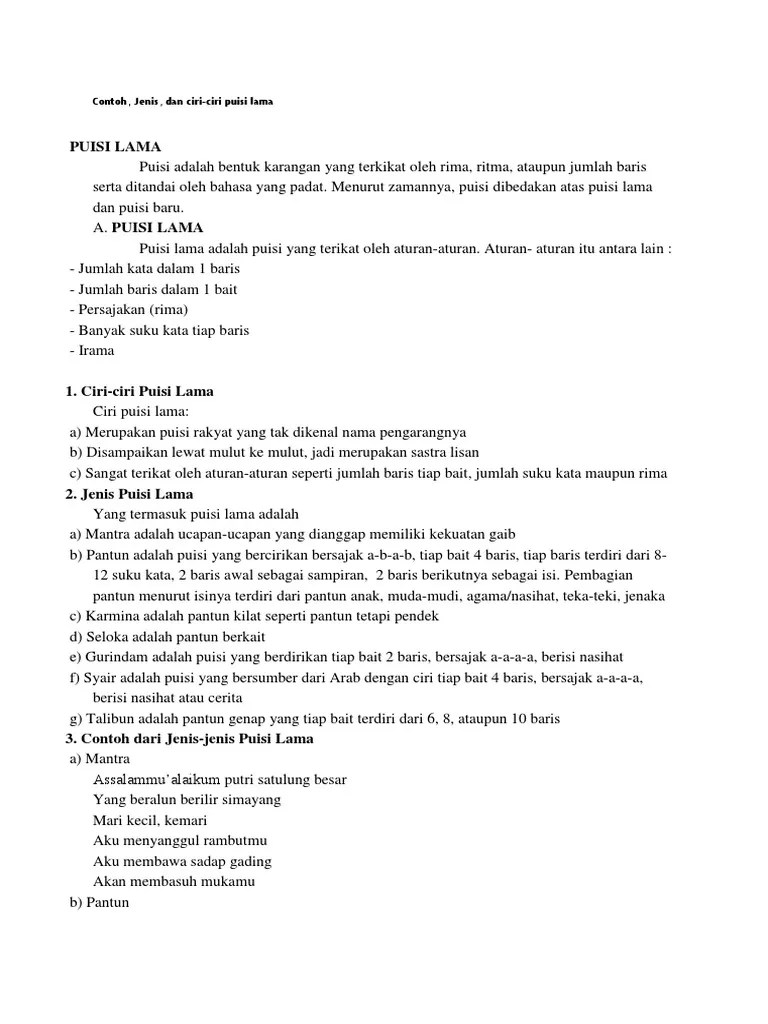4) berisi soal, masalah, atau perjanjian dan . Puisi lama yang bersajak a a a a disebut. Menurut laman kbbi, syair didefinisikan sebagai sebuah puisi lama yang terdiri atas empat larik (baris) dan semua uju lariknya mempunyai bunyi . Kurang pikir kurang siasat (a): 2) tiap baris terdiri atas 8 sampai 14 suku kata.